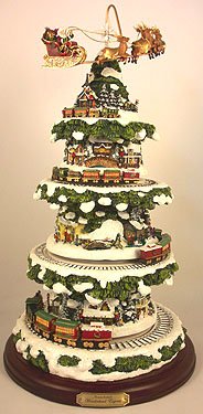 Market First Thomas Kinkade Animated Tabletop Christmas Tree with Music and Light! Rotating Santa Sleigh, Moving Trains! - As Santa and his reindeer joyously fly into the Christmas night, the Wonderland Express slowly chugs its way round and round the peaceful little village nestled amongst snow-kissed evergreen boughs. Now, you can capture the joy of this wondrous night in your home with an exclusive Collectibles Market First Thomas Kinkade musical animated tabletop Christmas tree with moving trains. It showcases four levels of rotating movement - including Santa and his sleigh - you'll watch as the train "climbs" ever higher up the tree and notice 12 brilliantly illuminated buildings and over 2 dozen handcrafted figures.All aboard for the merriest Christmas ever with this enchanting collectible Christmas home decor, available exclusively from Hawthorne Village. Inspired by the Painter of Light's(TM) beloved artwork, this handcrafted and hand-painted Thomas Kinkade animated tabletop Christmas tree plays a medley of beloved Christmas carols. Fully sculptural and intricately detailed, the holiday scenes are further enhanced with a blanket of glitter-touched snow. Makes a unique Christmas decoration or collectible gift for Thomas Kinkade fans. Heavy demand is expected, and you won't want to miss out. Order now!- Plays a medley of beloved Christmas carols as the train moves